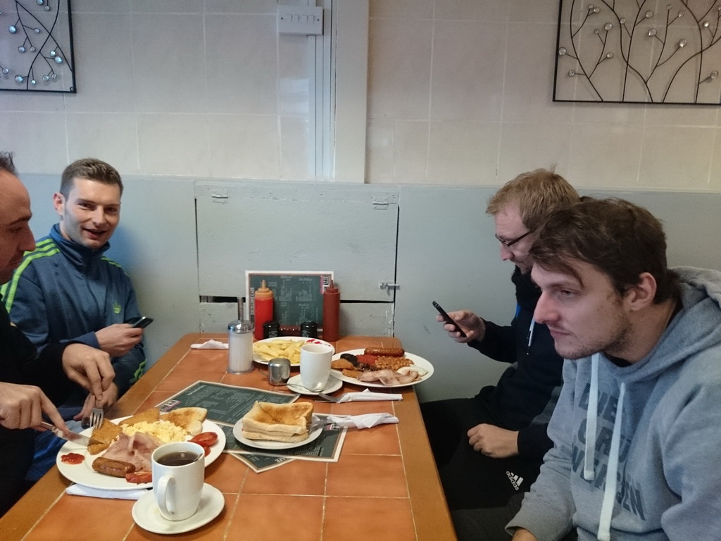 Am 11.01. ging es in der Früh um 6:00 Uhr mit unserem RSR-Bus in Mak los Richtung Bayreuth und Neudrossenfeld um die anderen Mitfahrer aufzugabeln. An Bord befanden sich 15 Getränkekisten, 3 Liter Kaffee und ein ausgedehntes Frühstück für 9 Mann. Die Fahrt führte uns über Bamberg, Würzburg, Frankfurt und Köln nach Mönchengladbach, das wir gegen Mittag erreichten. In der Nähe des „Borussia-Parks“ gab es ein griechisches Mittagessen und der Bus wurde noch einmal in Deutschland vollgetankt. Nach einer guten Stunde ging die Fahrt weiter nach Oostvoorne/Niederlande (neben dem Fährhafen Rotterdam), welches wir am Nachmittag erreichten. Die Fähre von Rotterdam nach Hull (England) legte erst um 21 Uhr ab (Check-In spätestens 19:30 Uhr), weshalb wir noch einige Zeit in Oostvoorne für ein gemütliches Bierchen und ein paar Dartwürfe in „Murphy’s Station“ zur Verfügung hatten. Daneben lag auch gleich die Pizzeria „Bella Roma“, bei der sich Einige ihr Abendessen mitnahmen. Um kurz vor 19 Uhr ging es dann mit unserem Bus Richtung Fähre und nach kurzer Kontrolle der Fahrtüchtigkeit unseres Fahrers durch die örtliche Militärpolizei (von denen einer leidenschaftlicher Anhänger von Feyenoord Rotterdam war und von uns total begeistert, da er auch Fankleidung von Rapid Wien sah) waren wir auch schon auf dem Schiff. Der Bus wurde abgestellt und noch eine kleine Wegzehrung für die Zimmer eingepackt, die im Anschluss bezogen wurden. Wir hatten eine 5-Mann- und eine 4-Mann-Kajüte gebucht. Der Abend klang dann gemütlich an der Bar der Fähre aus.